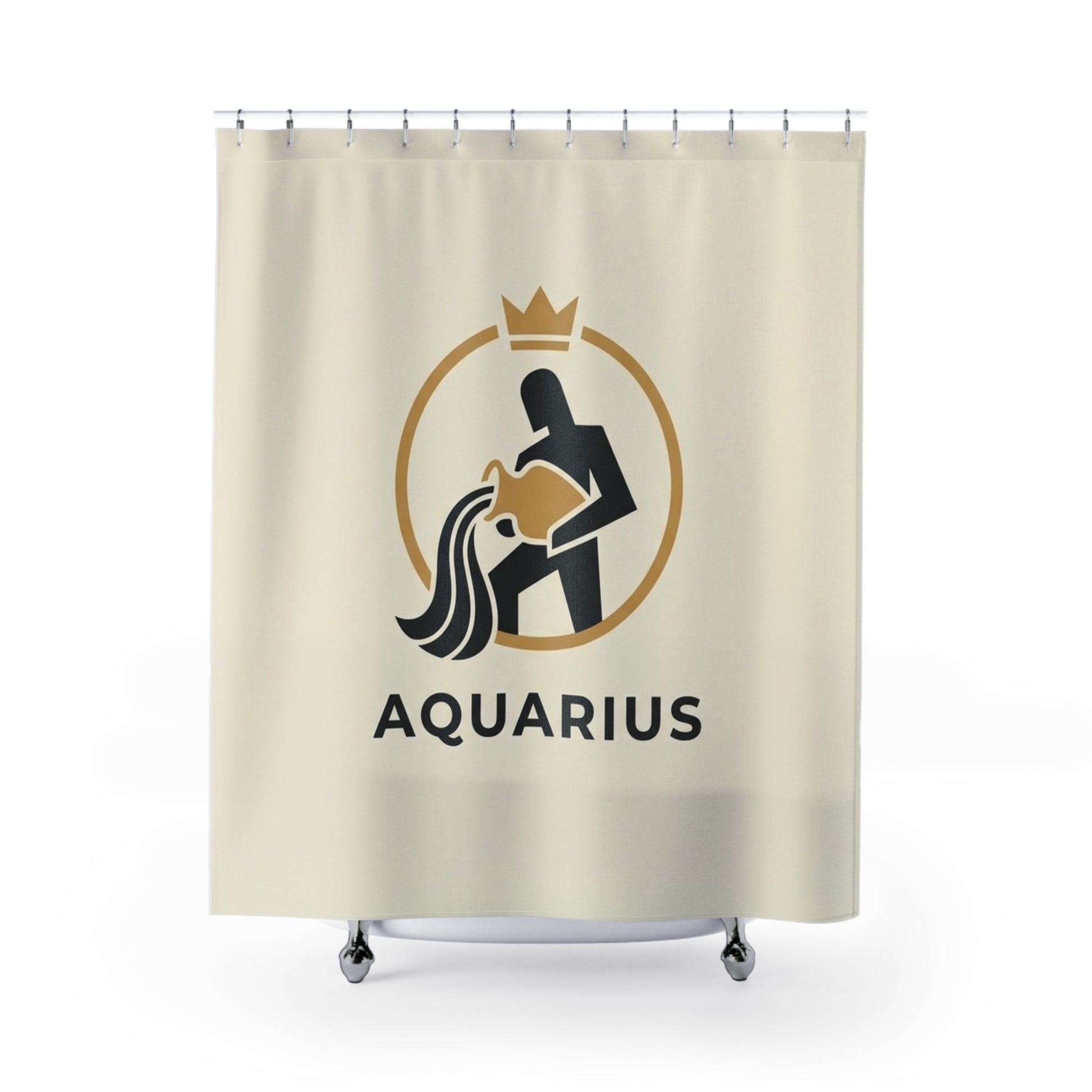 Bring constellation energy into your bathroom with a shower curtain that feels curated, calm, and quietly confident. The soft cream backdrop puts a minimalist Aquarius emblem front and center: a stylized figure pouring water beneath a subtle gold crown and circular frame. The design reads modern and symbolic — it settles the room with an understated personality rather than shouting for attention. Hang it to set a refined, zodiac-inspired tone during morning routines or late-night unwinding. It pairs well with warm brass hardware, matte black accents, or natural wood details to create a thoughtful, lived-in space that reflects independent, forward-thinking style.