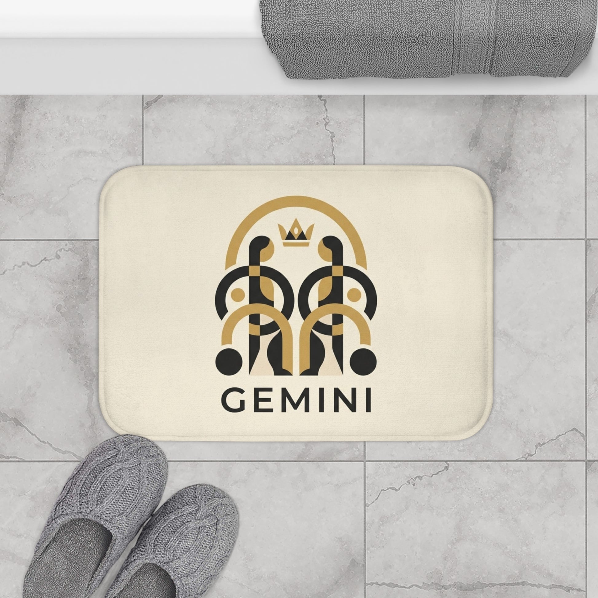 Step onto a little moment of personality. This memory-foam bath mat brings a warm, elegant nod to the Gemini spirit — clean cream ground, graphic black-and-gold emblem, and a tiny crown that feels quietly celebratory. It cushions each step with plush microfiber while the anti-slip backing keeps late-night barefoot wanderings secure. The reinforced edge binding holds the shape wash after wash. Place it in a vanity niche or by a tiny bathtub to add a wink of astrology and mid-century graphic style to everyday routines.