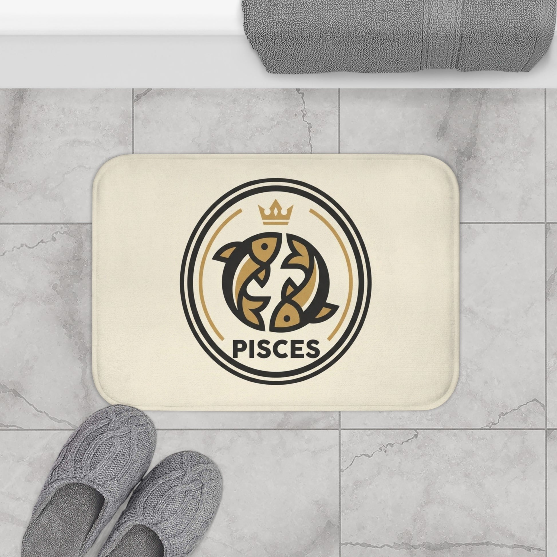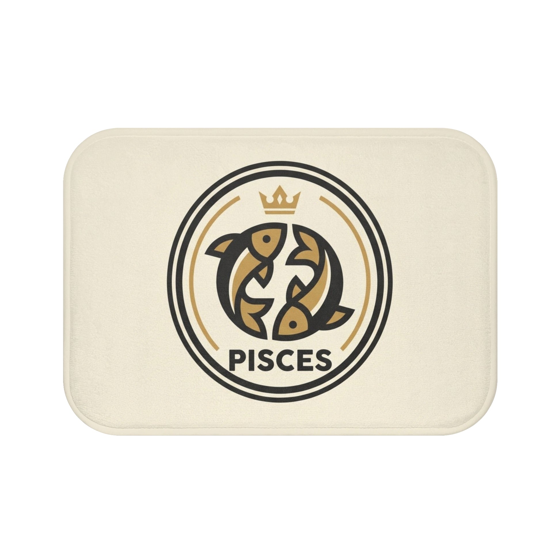 Sink your toes into a quietly luxurious moment each morning. This memory foam bath mat cushions and supports, while its soft microfiber surface and neat reinforced binding keep the silhouette tidy and lived-in. The design centers a warm, crest-like Pisces emblem — two stylized fish circling beneath a small crown — rendered in muted gold and deep charcoal on a creamy background. It reads like a personal token: a small ritual object that marks the start or end of a day, bringing a calm, zodiac-inspired touch to a narrow hallway, powder room, or beside the tub. The anti-slip backing grips the floor so the mat stays put through sleepy steps and hurried routines. Subtle, durable, and quietly personal — it’s for people who collect small comforts and like their interiors to feel thoughtful without shouting.